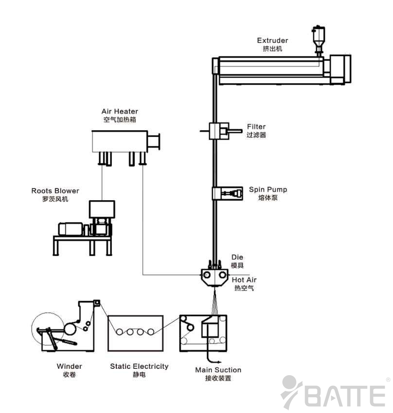 熔噴布換網(wǎng)器被應(yīng)用于熔噴布生產(chǎn)線中,其作用是:將熔體中的雜質(zhì)過濾掉,以免堵塞噴絲孔。