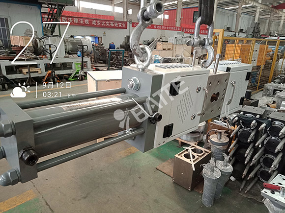 擠出機(jī)換網(wǎng)器為雙工作位替換工作,一慮網(wǎng)過(guò)濾,一慮網(wǎng)在換網(wǎng)器主體外備用。往復(fù)板板兩端有網(wǎng)塊保溫加熱裝置,用于過(guò)濾易結(jié)晶或易老化的塑料時(shí),在更換濾網(wǎng)時(shí)應(yīng)取出網(wǎng)塊,清除出網(wǎng)孔中的塑料。單板式換網(wǎng)器在更換慮網(wǎng)時(shí)有蓄能器增加動(dòng)力,因此更換濾網(wǎng)網(wǎng)的速度快、動(dòng)力大,在更換慮網(wǎng)時(shí)嚴(yán)禁網(wǎng)塊或?yàn)V網(wǎng)毛邊漏出往復(fù)板外面,更不允許用手觸摸。